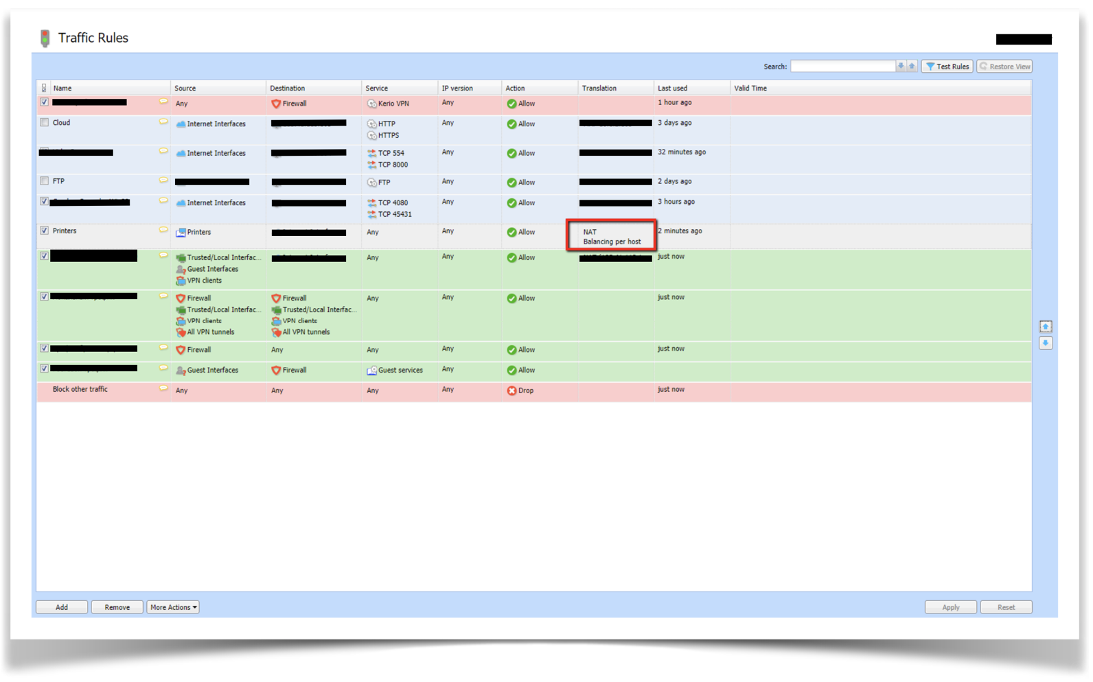 If the traffic rule for printers is already added and the feature is still not working, the traffic rule may be missing the NAT configuration, as shown below: